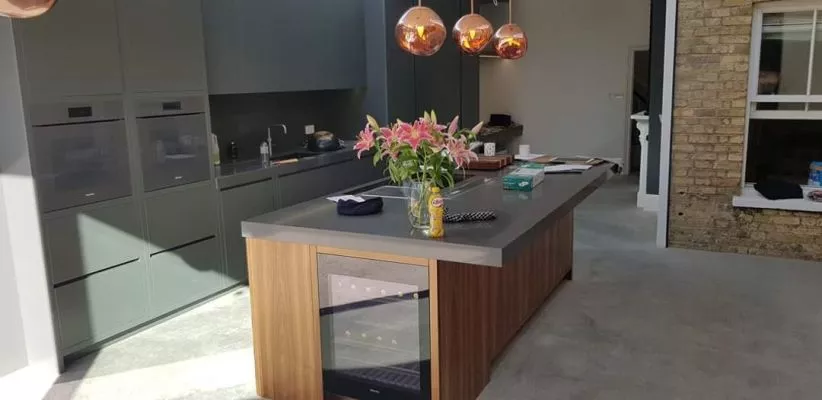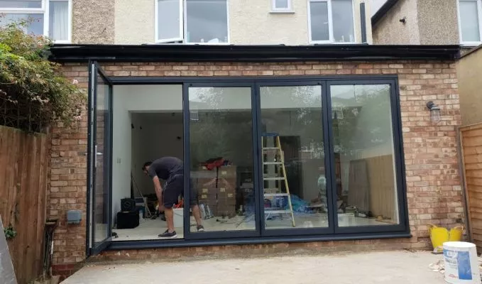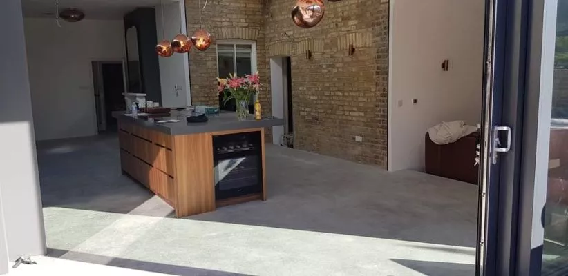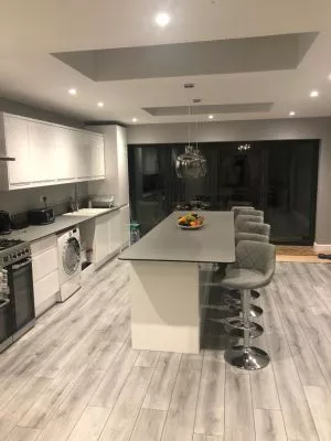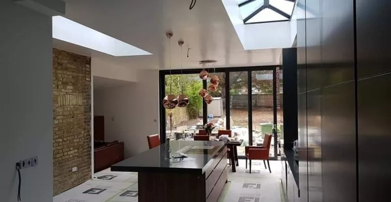 Sidcup – Rear and wrap around side extension with roof lanterns, bifold doors and long feature island. We also designed and constructed a bespoke coin topped bar for this project.